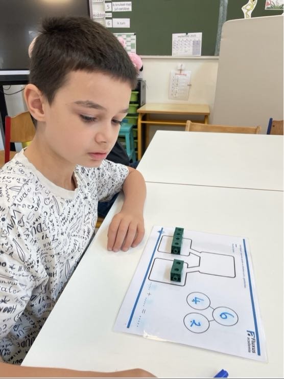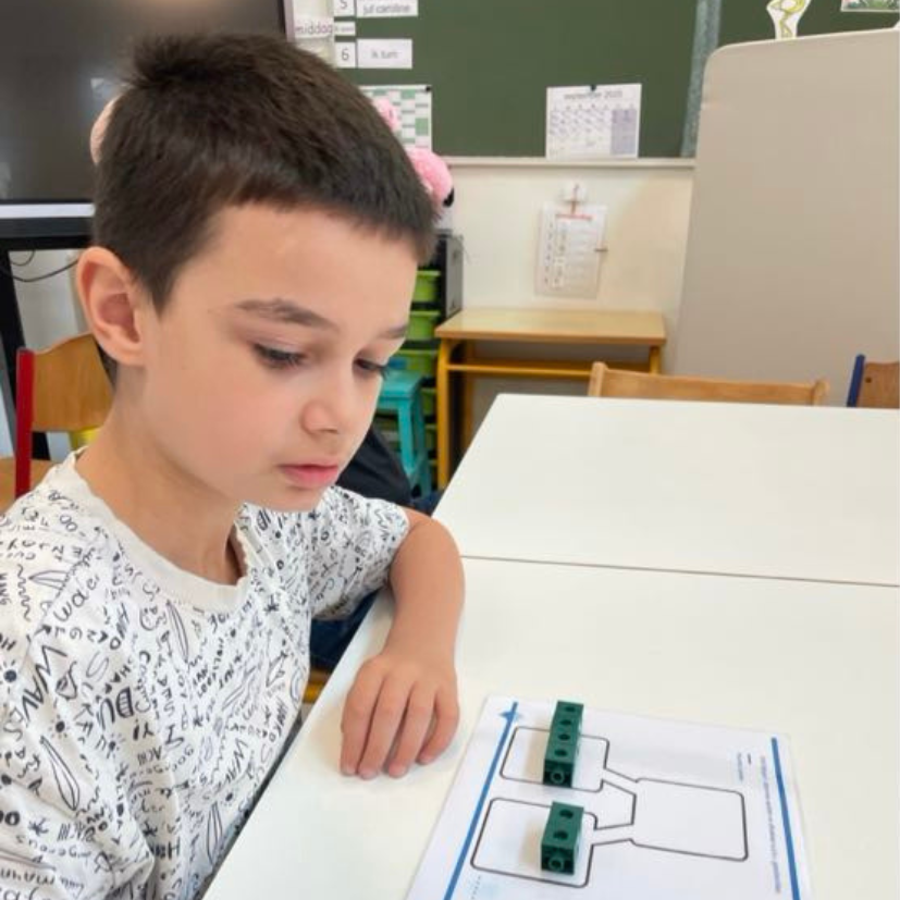 Het oefenen op de schoolse vaardigheden, zoals voorbereidend lezen, rekenen en schrijven, gebeurt in onze klas steeds in kleine groepjes van 2 tot 4 leerlingen of individueel met de leerkracht. Zo is het mogelijk om elke leerling op zijn niveau te laten oefenen op het tempo dat hij zelf aangeeft. Wanneer hij er klaar voor is, zetten we een stapje vooruit. Soms gaat dit met kleine stapjes, soms kunnen we meteen een hele sprong vooruit zetten.