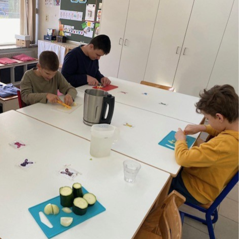 Verder oefenen we doorheen de dag op huishoudelijke vaardigheden zoals afwassen, de vloer vegen, boterhammen smeren, groenten en fruit snijden, …